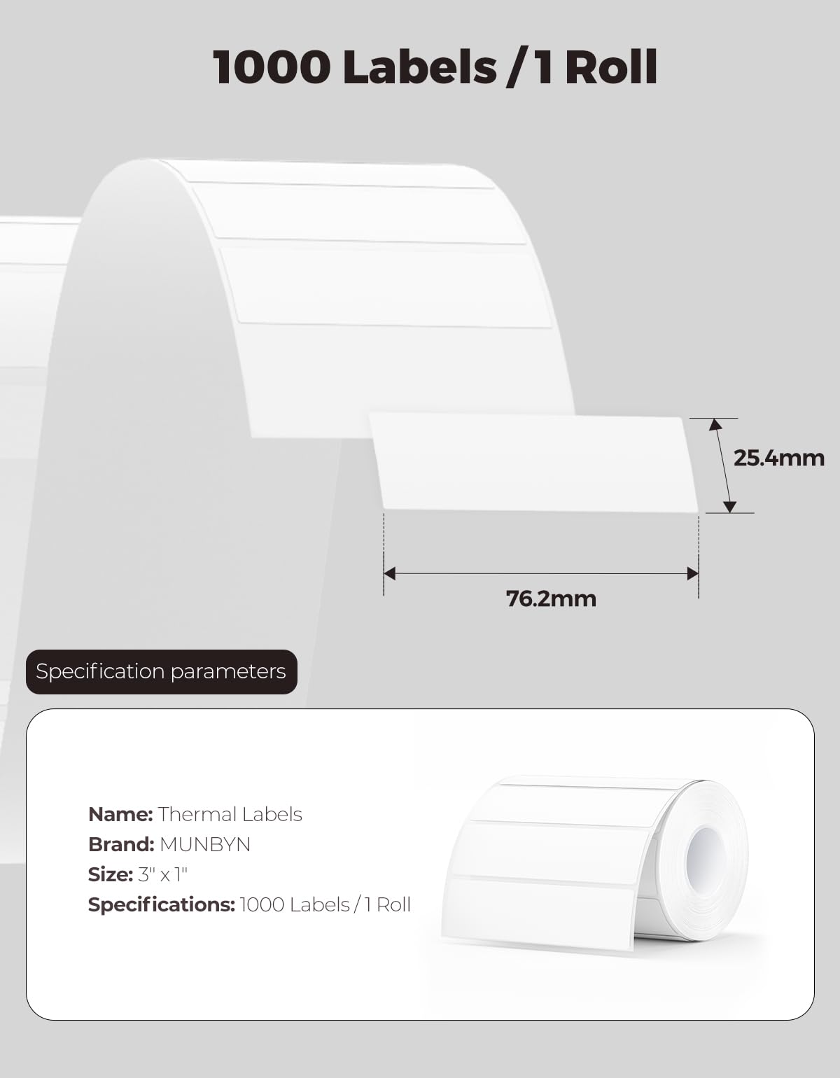 - Munbyn Generic Rectangle Series Labels (GR): 3" x 1" (76mm x 25mm) thermal labels come in rolls of 1000 labels. (Note: These are designed for thermal printers only, not for laser or inkjet printers)