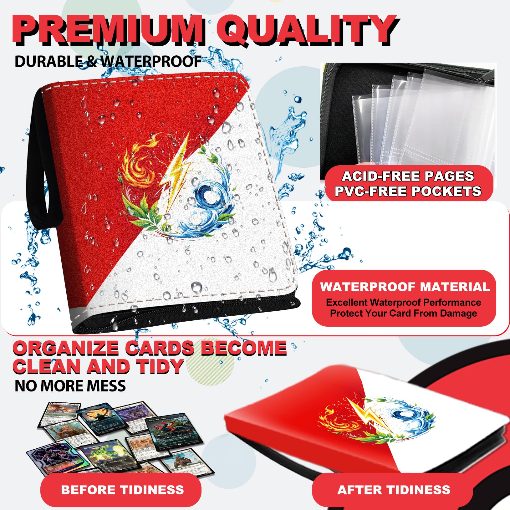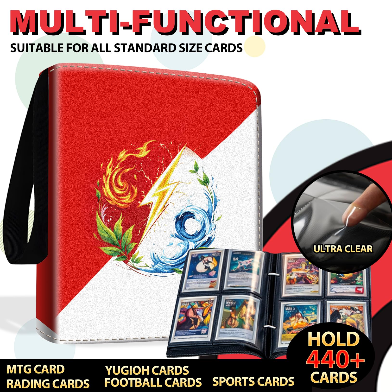 • ⚡️【Multiple Protection for Collectible Display】Card collection binder employs Generation IV Card Sleeves to protect every single trading card, which are made of Archival-Grade PP, and are Thicker & Anti-Scratch, More Transparent, Waterproof and Dustproof. Plus, we aim to help display the premium cards in High Definition (HD) and prevent them from secondary pollution.