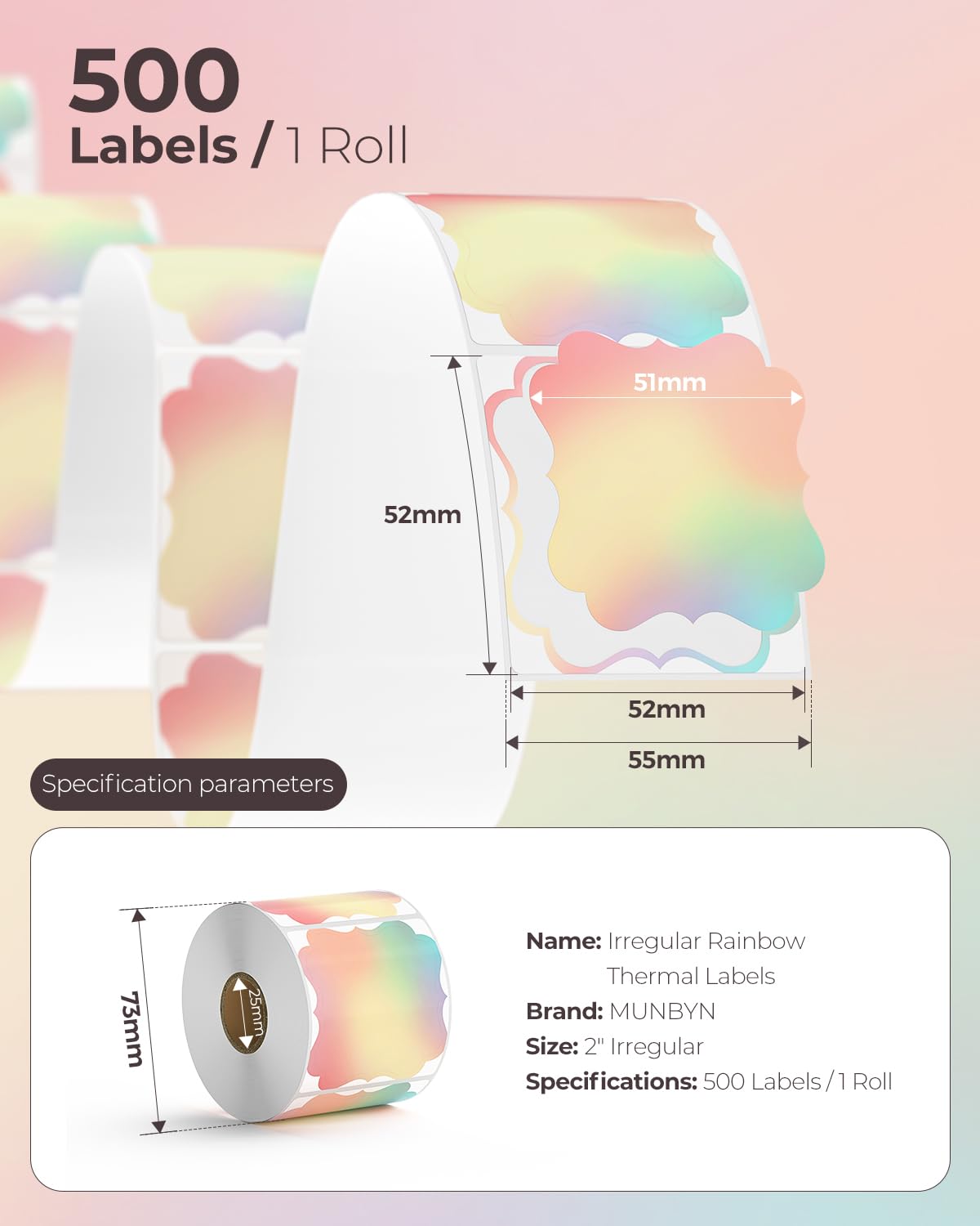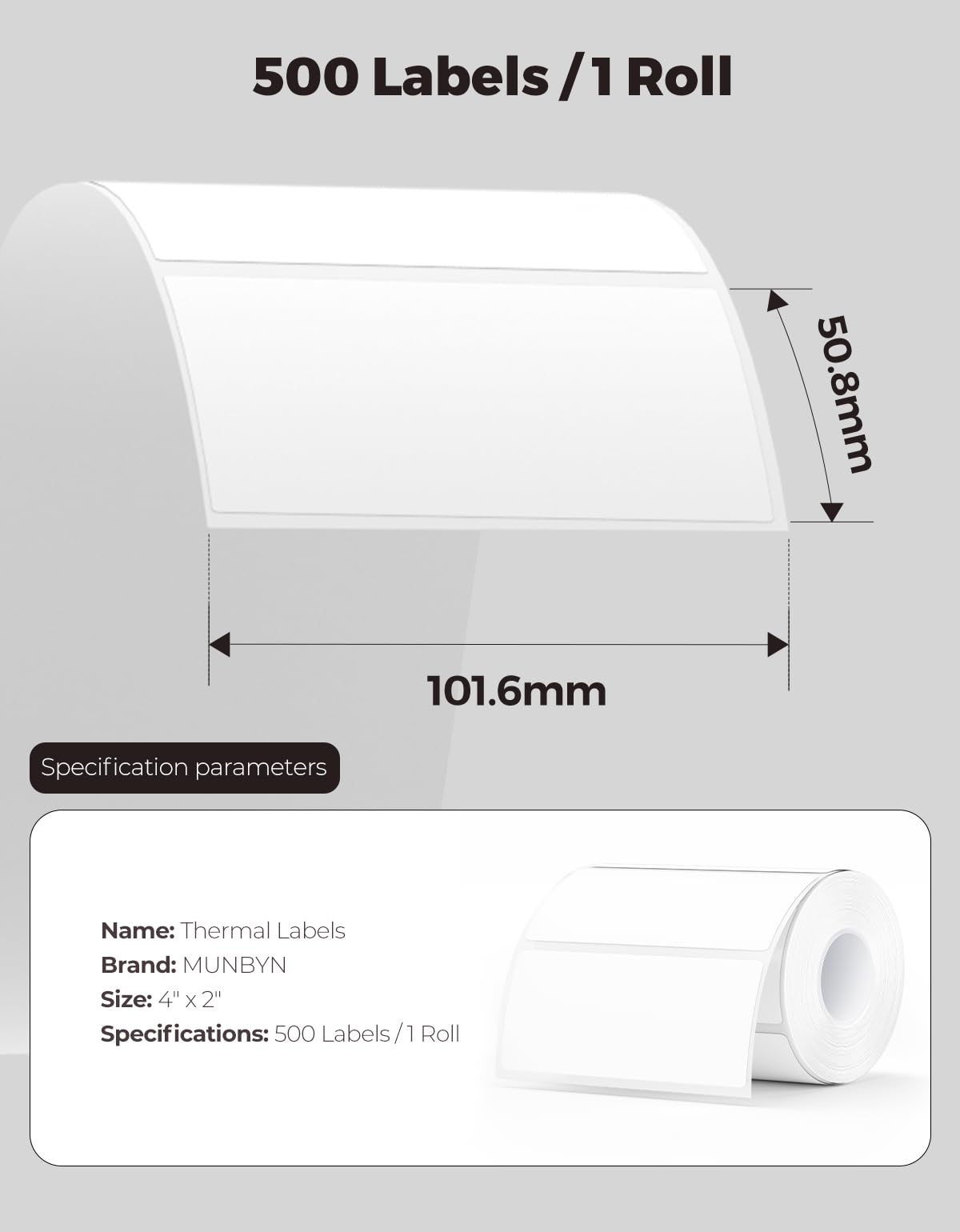 • Munbyn Generic Rectangle Series Labels (GR): 4" x 2" (101.6mm x 50.8mm) thermal labels come in rolls of 500 labels. (Note: These are designed for thermal printers only, not for laser or inkjet printers)