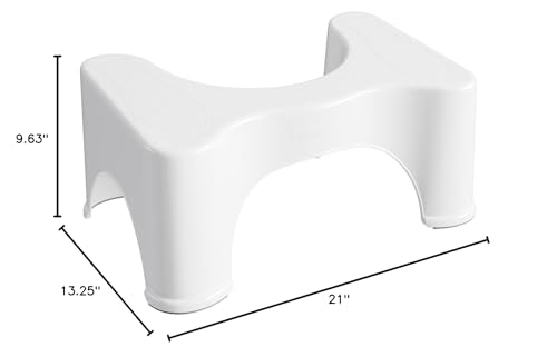 Details: Original 9" Stool Dimensions: 13.25"D × 21"W × 9.63"H. Sizing Tips: How to Pick Your Squatty Potty. (1) By Toilet Type: The 9" Squatty Potty Original Toilet Stool is designed for a comfort toilet (16.5–18" from floor to the top of the bowl). If you have a 14–16" standard toilet (measured from the floor to the top of the toilet bowl), then you may want the 9" stool instead. (2) For Advanced Squatters: You may prefer the 9" stool, which raises your feet 9" off the floor. People who are limber and comfortable in a full squat, or have shorter legs, will find the 9" stool easy to use. (3) For Large Households: The 7" Original Toilet Stool is sized for most squatters. If you have people of varied heights using the same bathroom, you might consider the Adjustable 2.0 Stool, which features a 7" stool with a riser you can add to make it a 9" stool. We also offer kid-sized stools called Potty Pets.