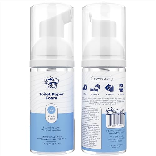 Details: 2-Pack Toilet Paper Foam (50 ml each) Details: Replace your so-called flushable wet wipes with our septic friendly toilet paper foam alternative to wet wipes. Squatty Potty toilet tissue moistener is designed to cleanse after you go. For external use only. Designed for exterior use on both your front and back business. If you’re looking for travel size for a purse or a pocket, we offer that separately. Stop leaving stinky trash filled with wet wipes everywhere you go. This body foam cleanser is flushable and sewer friendly! To Use: Pump foam onto your TP, wipe, then flush.