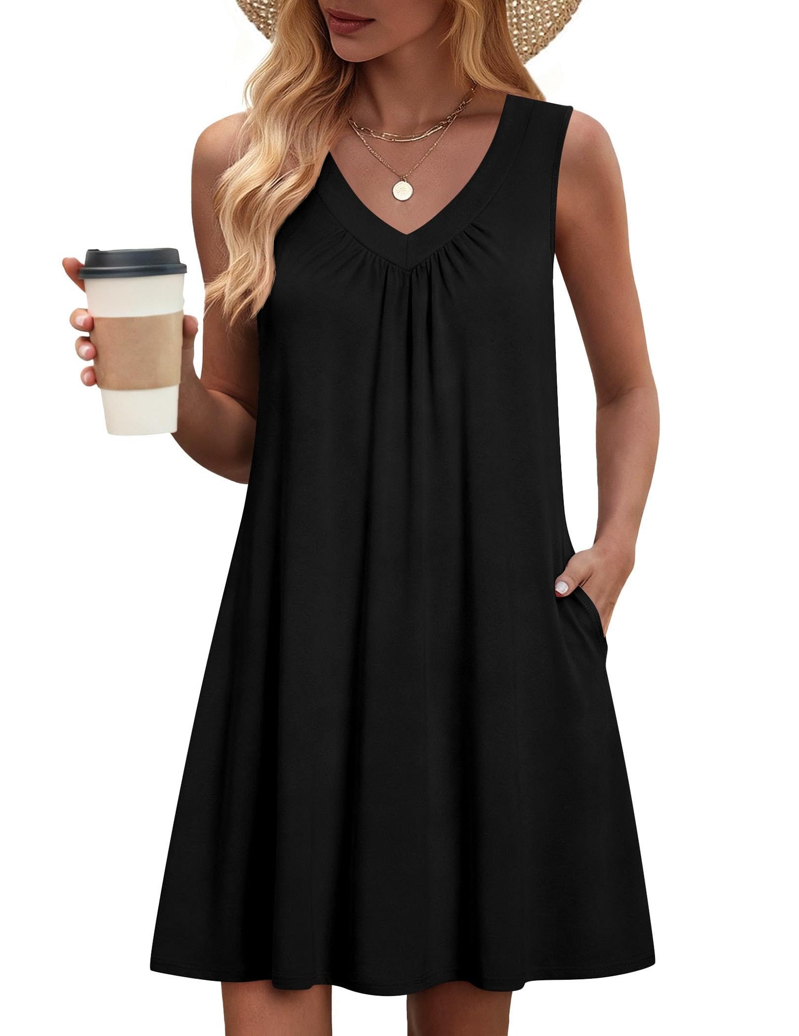 - Features: Feminine pleated v-neckline accentuates your sexy collarbones,sleeveless, knee length, swing hem, soft tunic. Two side pockets can convenient provide extra storage for carrying small items.