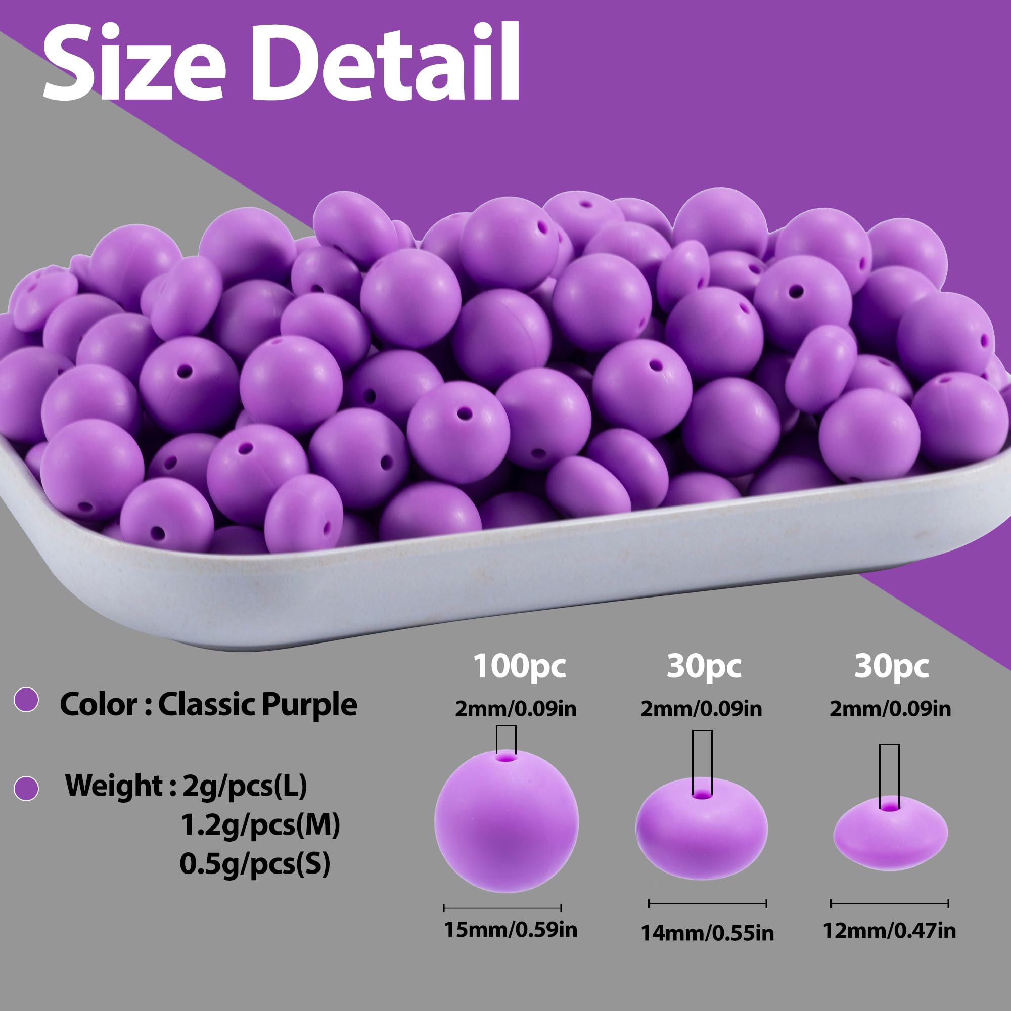 - Variety in Size and Shape: Total 160pcs classic purple silicone beads, including 100pcs 15mm Silicone beads, 30pcs 14mm Silicone Lentil Beads, 30pcs 12mm spacer abacus Beads. The hole of all silicone beads is 2mm, easy to match with each other or other beads, such as glass beads, acrylic beads, letter beads, wooden beads, focal beads, heart beads, hexagon beads, printed beads, etc.