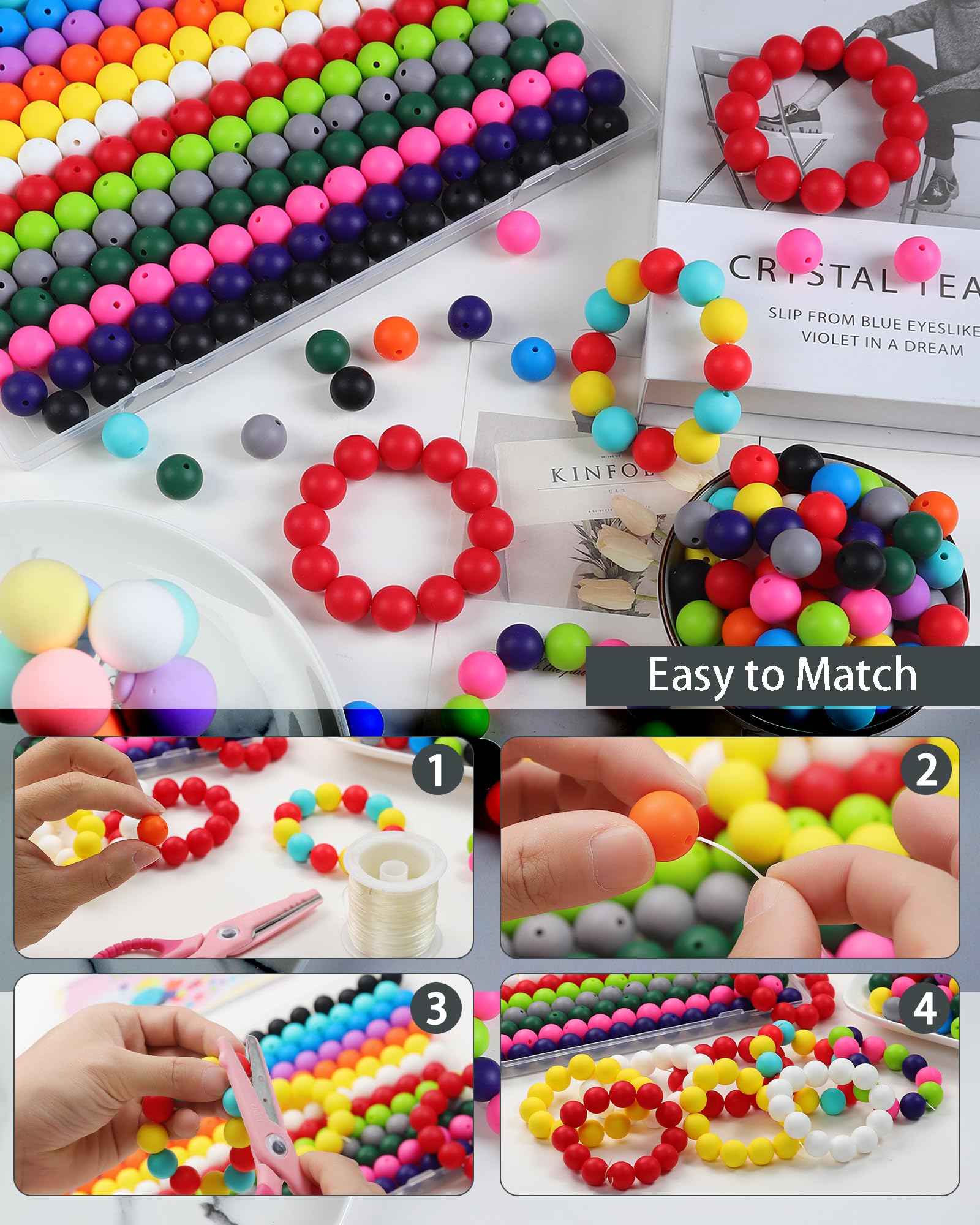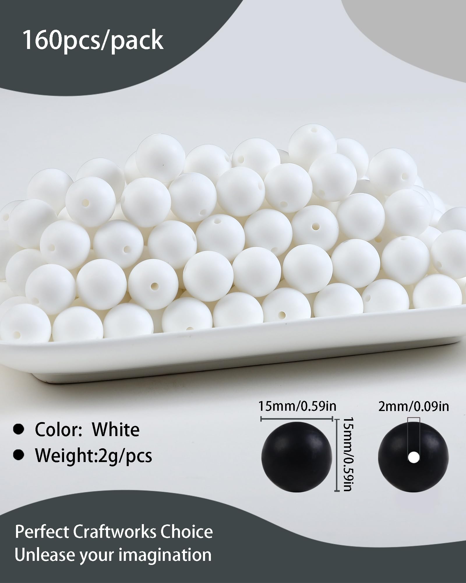 - Bead Assortments and Size: The package includes 160pcs round silicone beads 15mm, stored in a spacious plastic container. Each bead features a convenient pre-drilled 2mm hole, making it easy to combine them with various bead styles to suit your DIY crafting projects. At 0.59 inches in size, these silicone beads pair well with different shapes such as acrylic, letter, wooden, focal, heart, lentil, hexagon, and printed beads, providing plenty of options for creating necklaces and bracelet