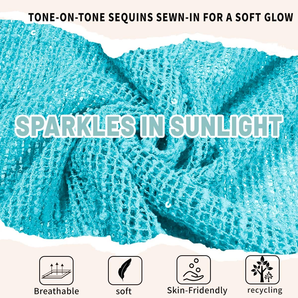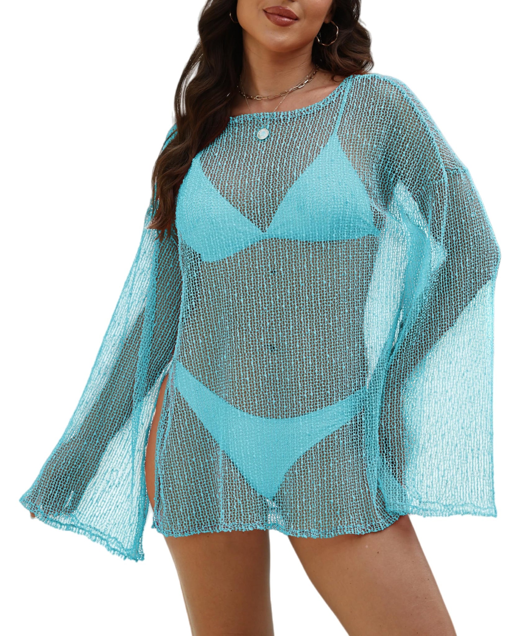- FEATURES: This swimsuit coverups featuring a sheer hollow out, side splits, long sleeves, crew neck, solid color. The tiny sequins that randomly reflects on the light and shines. It offers a loose, flowy fit that highlights your curves while maintaining coverage