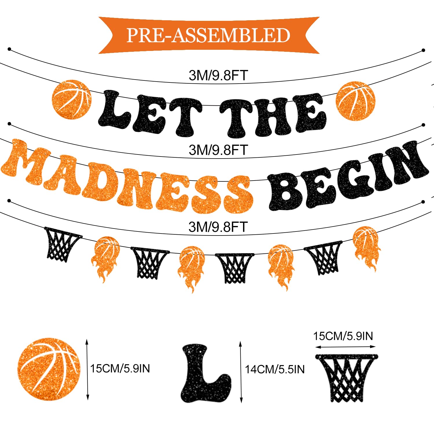 • WHAT YOU WILL GET - Let The Madness Begin Banner Set , includes three separate strands, one says "LET THE", one says "MADNESS BEGIN", the other is glittery Basketball Pattern string, 6pcs Basketball theme hanging swirls, and the other is 3pcs Basketball theme ornaments, perfect for your College Basketball Party and will definitely be popular on social media.