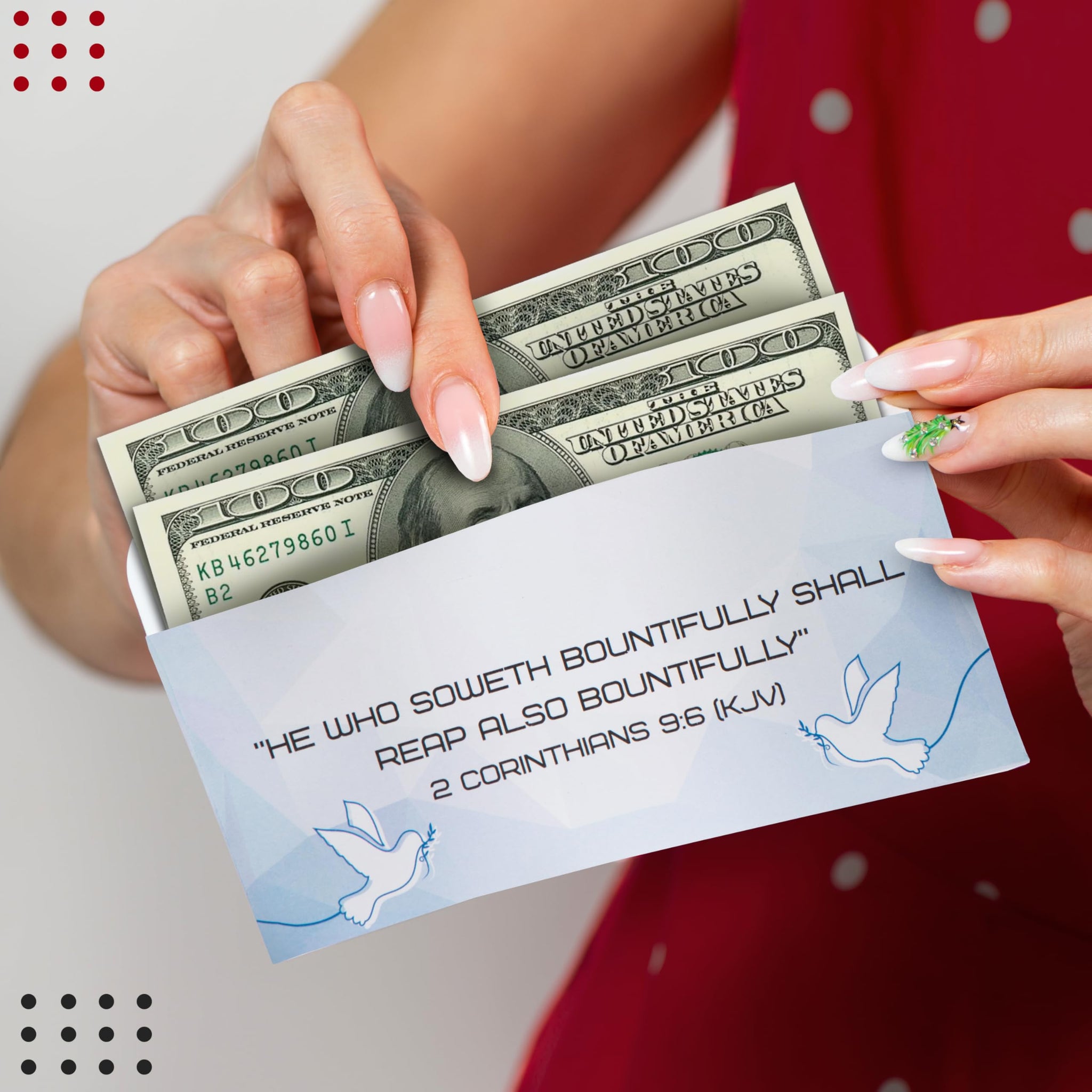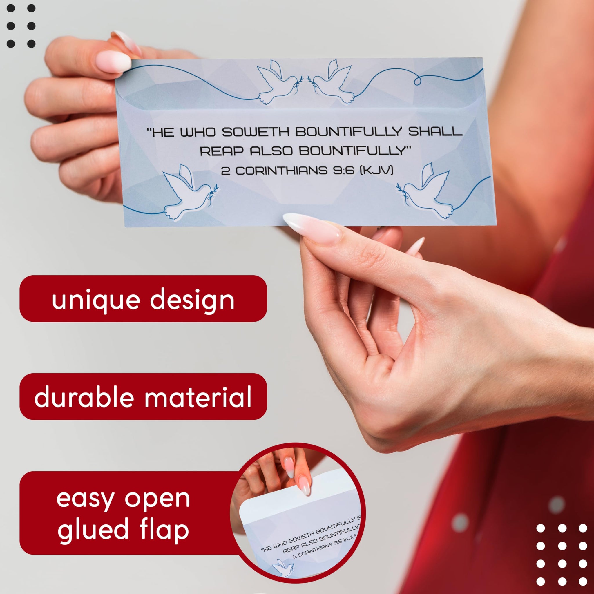 - Beautiful Dove and Scripture Artwork: Soft blue design with graceful doves and the verse “He who soweth bountifully shall reap also bountifully” 2 Corinthians 9:6 KJV; adds a gentle visual reminder of cheerful, generous giving