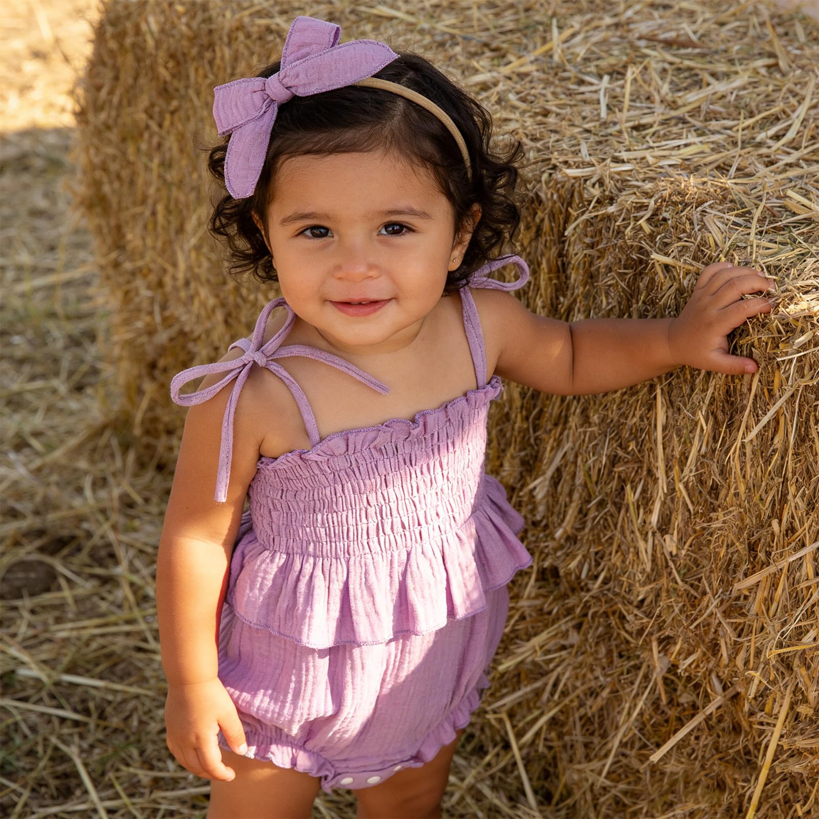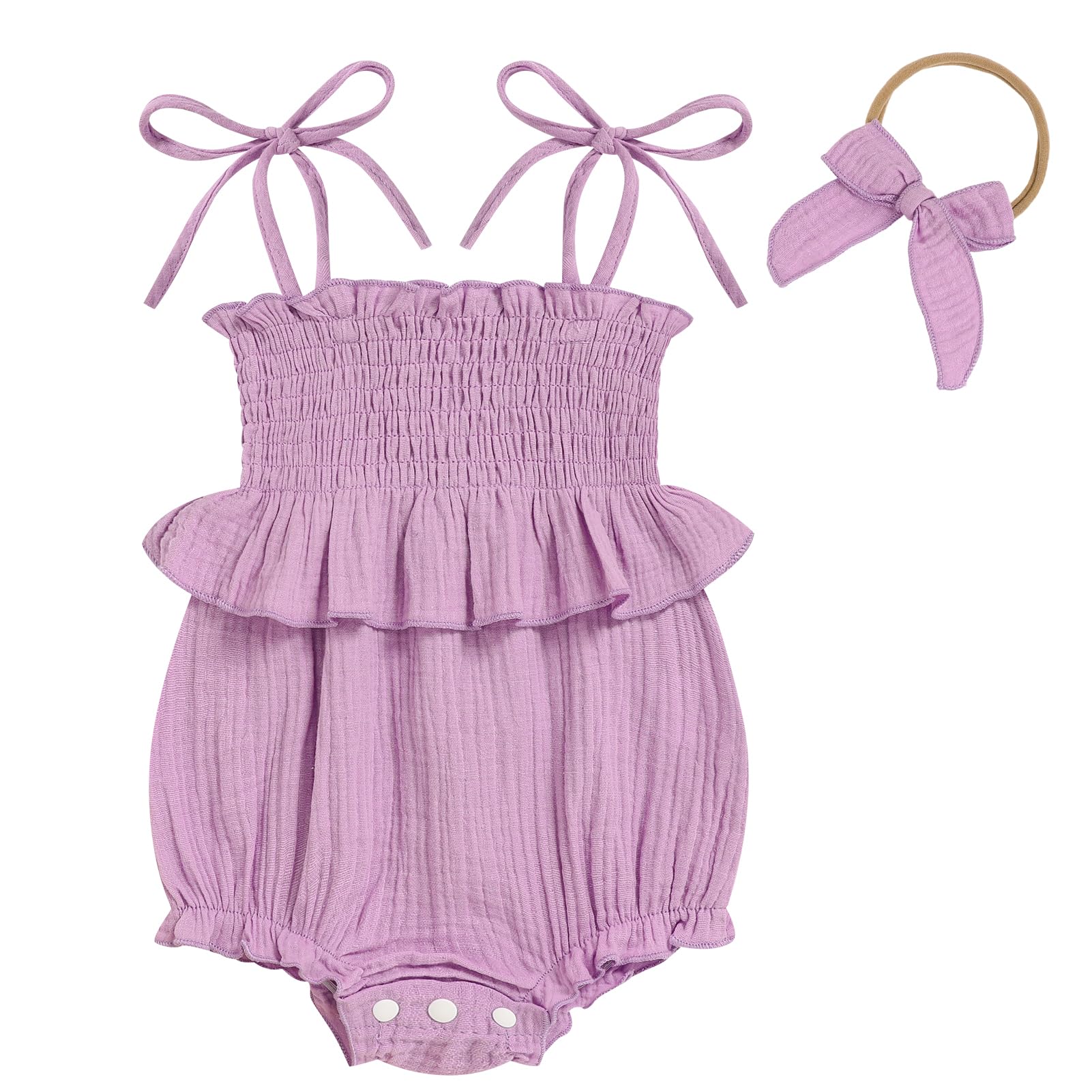 - DETAILS: Smocked romper with delicate ruffle, button for easier changes, comfort-stretch on leg holes.