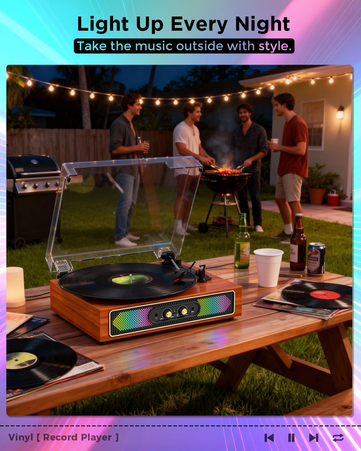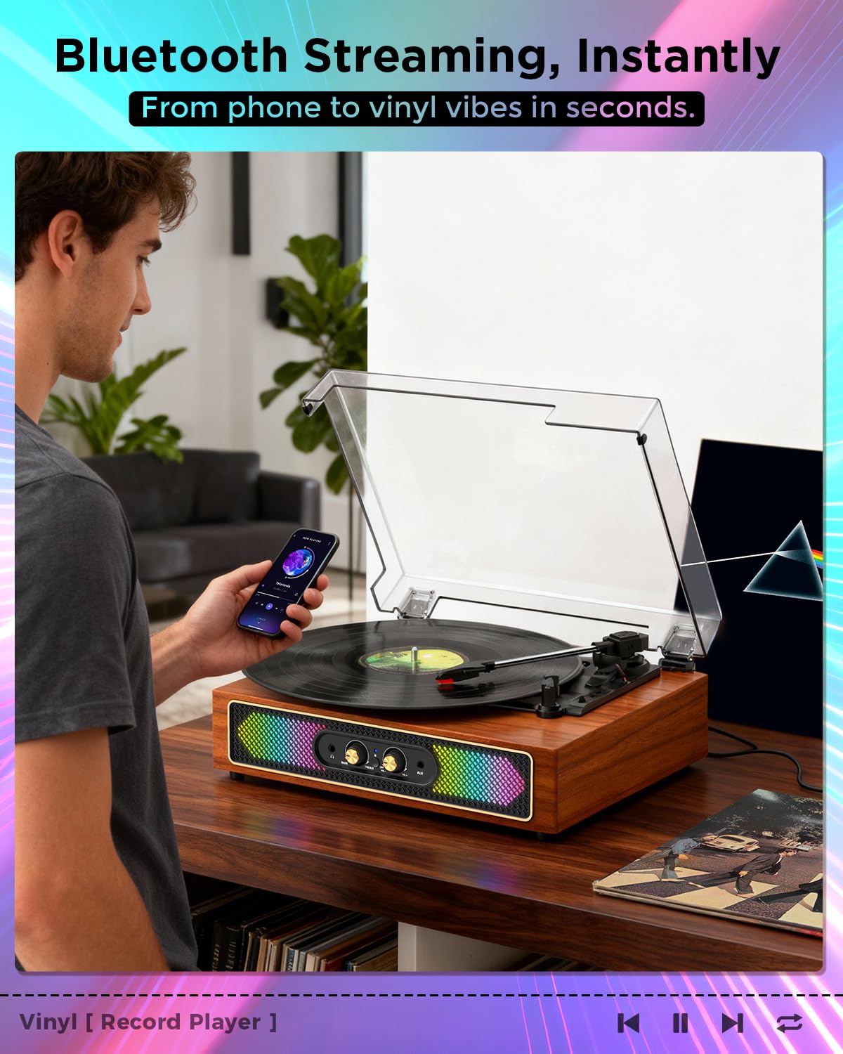 - RGB Ambient Lights That Set the Mood: Create a cozy vinyl atmosphere with customizable RGB lighting that shifts from warm to vibrant—perfect for relaxing evenings, study sessions, or adding décor-friendly glow to your bedroom or living room. A stylish Bluetooth record player that doubles as modern home décor