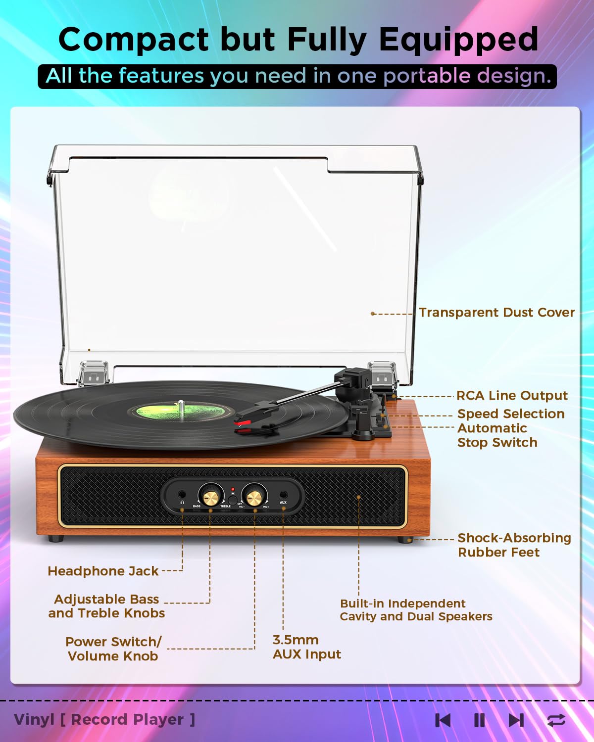 - Clearer Sound with Independent Sound Cavities + Tone Control: Built-in stereo speakers feature independent sound cavities for richer, cleaner audio—no muffled sound, no distortion. Fine-tune your music with Bass & Treble knobs, giving vinyl lovers fuller lows and brighter highs. A great vinyl record player for beginners and collectors