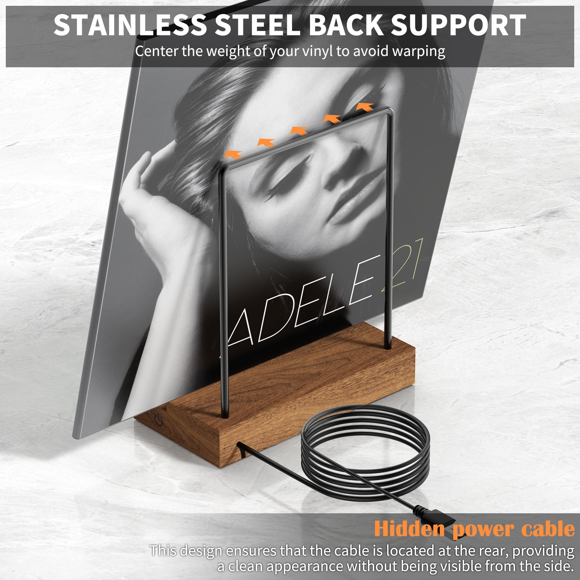 - 【Minimalist】Crafted from four main components – a premium walnut base, a sturdy stainless-steel rod,RGB sound control LED light bar, and a transparent acrylic letter with a metal cover – our now playing vinyl record holder combines minimalist design with enhanced durability. High-quality materials ensure stability and longevity.