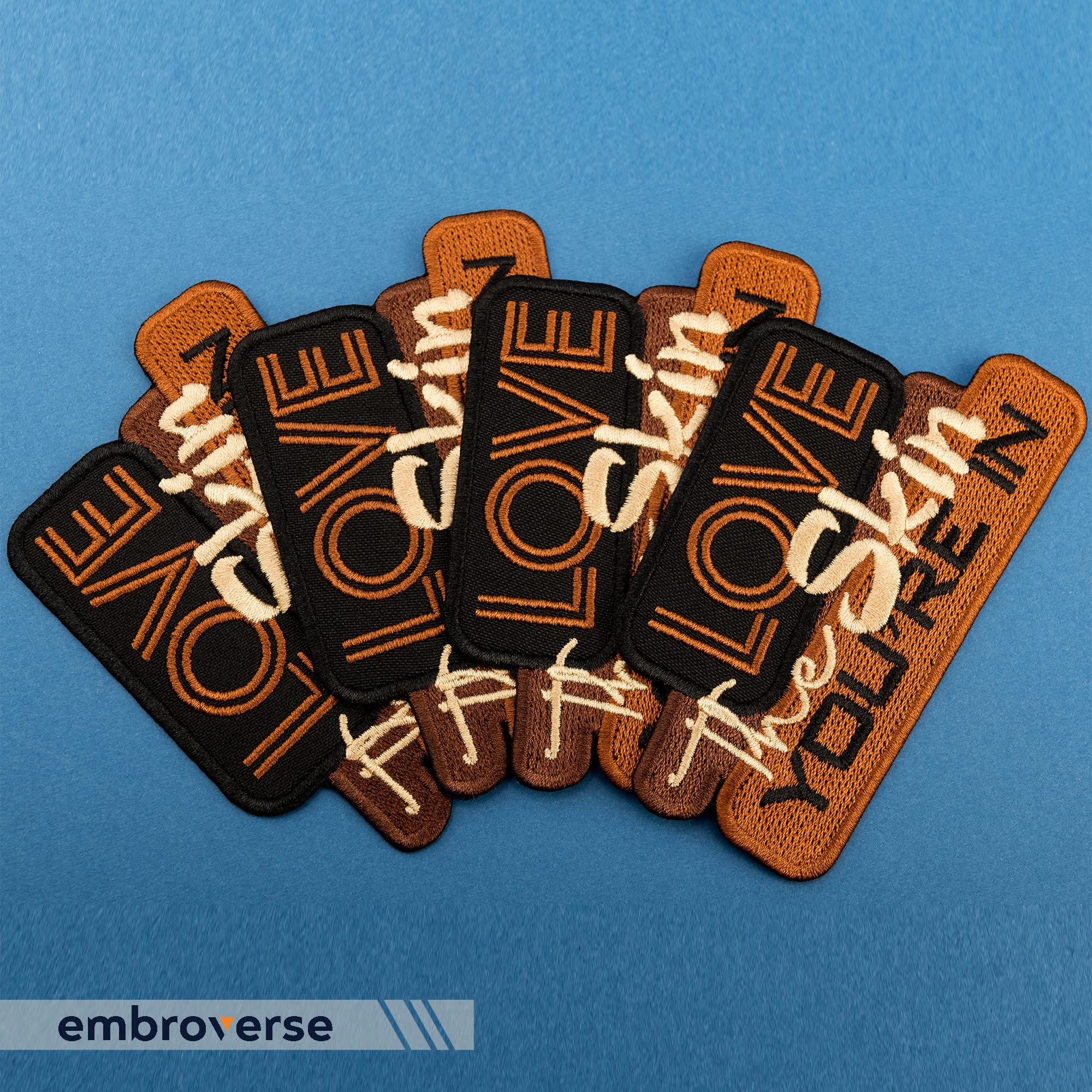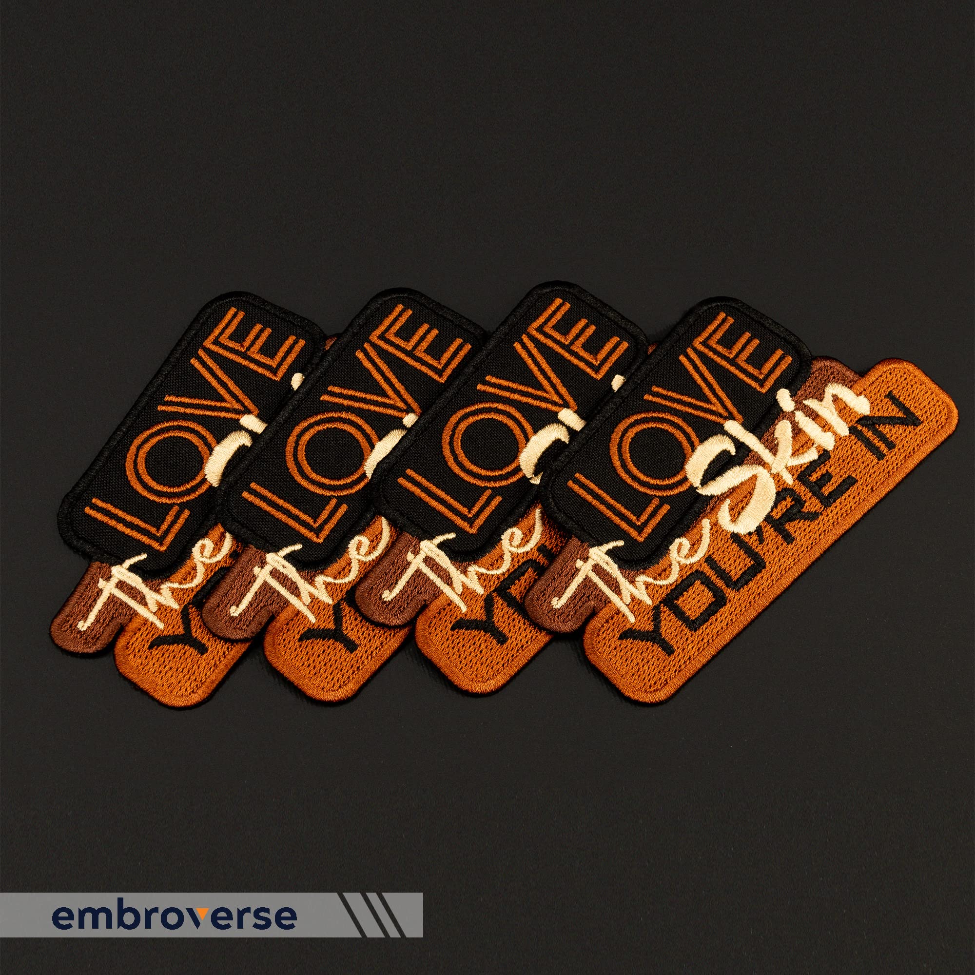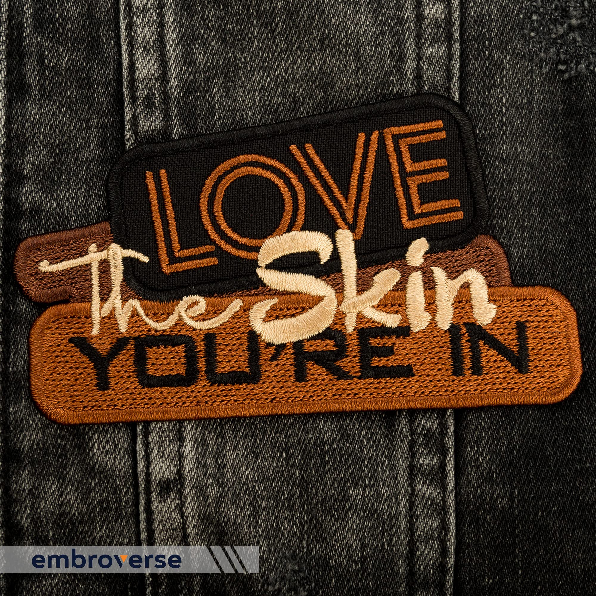 Details: Product Details: High-Quality Embroidered Patch Love The Skin You're In Patch Premium Twill and Gabardine Fabric Reinforced Viscose and Polyester Thread Machine Washable Once Applied Dimensions: 4.3 x 2.4 inches (10.9 x 6.2 cm) Custom Options Available