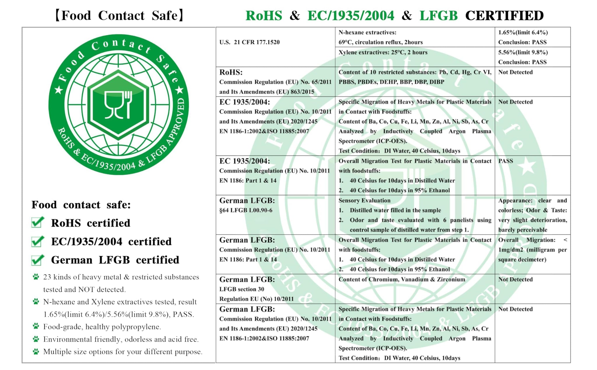 - 100% food grade safe, non-toxic, odorless, FDA and RoHS & EC/1935/1004 compliant and German LFGB certified.